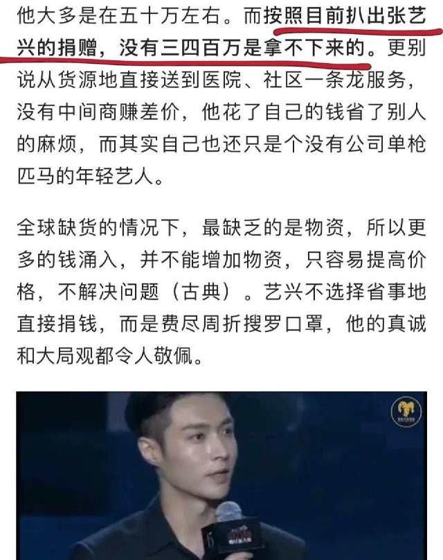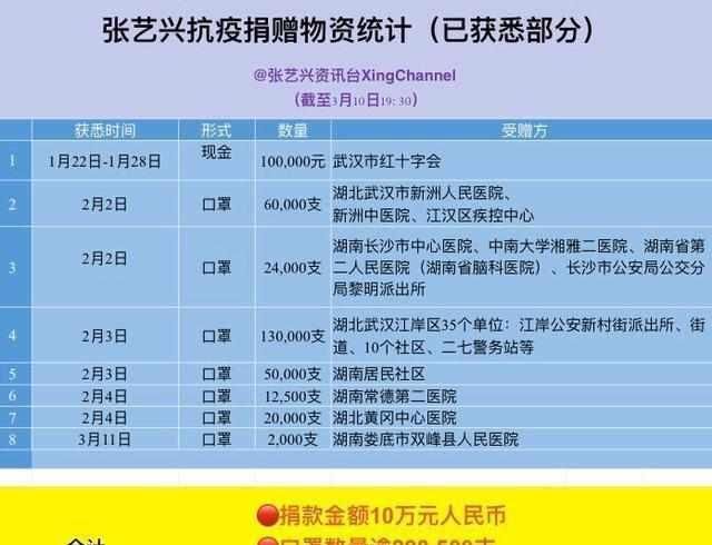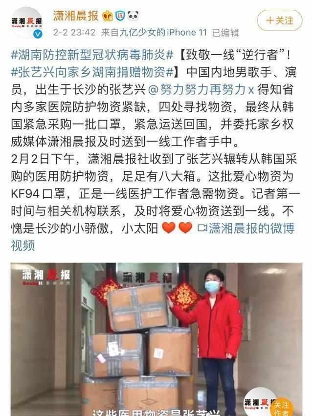 其实从疫情开始,知道国内口罩紧缺,张艺兴就立即从韩国寻找口罩寄回国,送到各省各地,包括容易被忽略的社区、街道、警务处等等地方,同时也捐了现金,但他一直很低调,都是被人发现了发在网上大家才知道。截止至今已获悉的口罩已将近30万支,总价约几百万人民币。