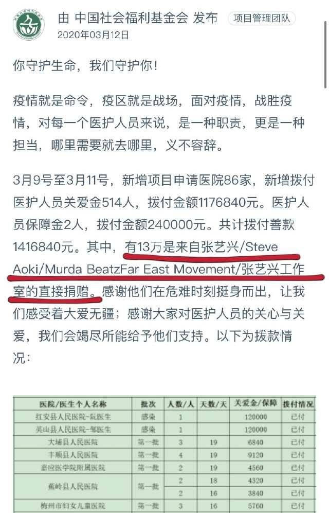 3月12日,中国社会福利基金会公布了捐款名单,有人又发现了张艺兴的名字,这次是和他的朋友一起捐的,总额13万!