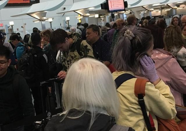 美国民众杰森·怀特利在推特上写道,“排长队等待入境的旅客告诉我们,美国海关/移民局没有提供洗手液、手套或口罩。”